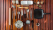Stop motion timelapse of important kitchen utensils and cooking items displayed in a neat overhead/flat lay manner on a wooden table.