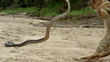 Slow motion medium shot lion cub approaching python / python striking and biting lion on the nose / Africa - Vídeo de stock HD