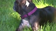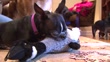 Small, old, black dog with white face chews on toy at Young at Heart senior pets adoption organization in Palatine, Illinois.