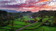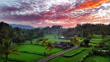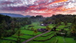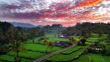 Sunrise aerial view of Mount Agung, Beautiful view of rice fields with Agung Volcano at sunrise, Aerial view of terrace field in Sidemen Valley