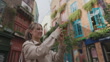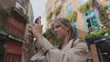 Teenage girl sightseeing London, UK. The girl is walking in the square by the Neal's Yard street and she is filming the charming buildings.