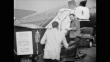 The Munsters TV show style coach vehicle parked at Kennedy Airport / CU sign on window stating: 'NEW YORK IS A MUNSTER FESTIVAL' / Actors Al Lewis and Fred Gwynne of the show step off plane / Lewis and Gwynne get on coach and slowly drive away.