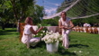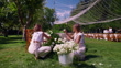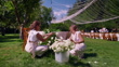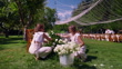 Moments of the team working on floral decorations for the tables at a wedding event.