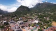 To down aerial drone view of stands in the Feira do Alto in Teresopolis, Rio de Janeiro, Brazil with a reveal of the surrounding landscape - Vídeo de stock 4K