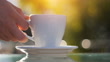 Unrecognizable person drinking from the cup of fresh hot drink with real steam on it, outdoors in autumn