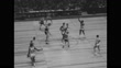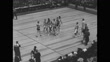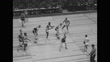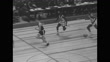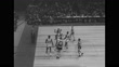 Title Card: "West Routs East in All-Star Basketball" / WS game / LS start of game / LS East in passion of ball - #10 Hal Lear, player from Temple University, shoots for basket and ball goes in for goal / West in possession of ball - #22 Paul Judson, Captain of the Illinois Illini basketball team, shoots and misses and #21 K.C. Jones, Guard from University of San Francisco Dons, takes possession of ball goes out towards center court and shoots for basket - ball goes in fro goal / CU crowd cheering / East in possession of ball - #11 Bill Uhl, All-America Center from the Dayton Flyers tries to shoot for basket but West #24 Bill Russell, All-America Center from the University of San Francisco Dons, hits ball out of hand of East #11 Uhl and West takes possession / MS crowd watching / West player shooting for basket at beginning the scene - ball starts to come off backboard at end of scene / Angle West #24 Russell on rebound taps ball in for goal / West in possession - #23 Willie Naulls, player for U.C.L.A. shoots for basket but ball does not go in, West retains possession and #22 Judson passes to #24 Russell who makes lay up shot for goal / Angle view East starting down court / East in possession - #15 Jim Paxson, team Captain for the Dayton Flyers, shoots for basket and ball goes in for goal / Angle view West #24 Russell passes out to #22 Judson who starts to shoot or basket / CU crowd / Angle view ball going into basket for goal for the West / West in possession of ball - #21 Jones shoots for basket - misses same and West #26 Julius McCoy player from Michigan State, gets ball and shoots for basket and ball goes in for goal / MS crowd standing up cheering / WS break up game #24 Russell is in the middle of players as they shake hands / Note: exact day not known