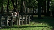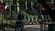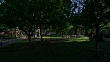 WIDE ANGLE OF MCGOLRICK PARK IN GREENPOINT NEIGHBORHOOD OF BROOKLYN. POSTMAN PUSHES CART ON SIDEWALK PAST A PLAYGROUND AND CHILD ON SWING SET. WOMEN REST ON A PARK BENCH BENEATH TREES WHILE A MAN AND BOY, POSSIBLY FATHER AND SON, PLAY CATCH IN THE GRASS. BASEBALL.